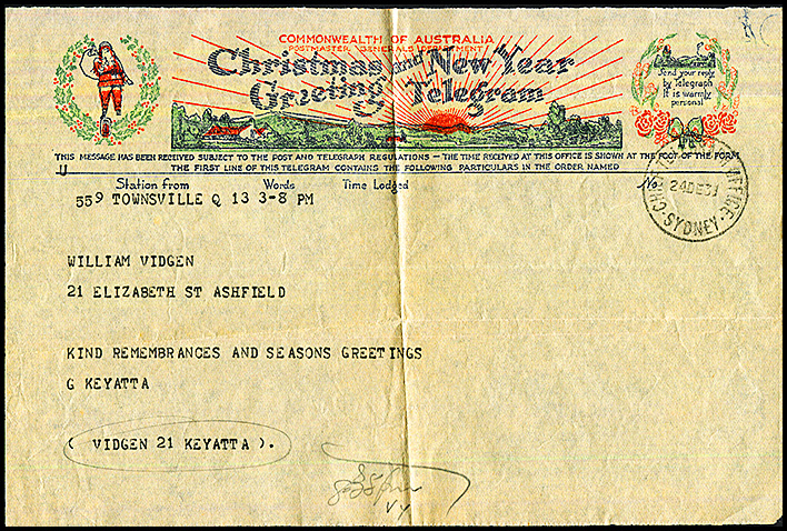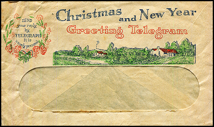 This envelope accompanied the above delivery form for 24 December 1931. Given its scarcity, it is assumed that the two items met at the Telegraph Office the day before Xmas 1931 :-). |