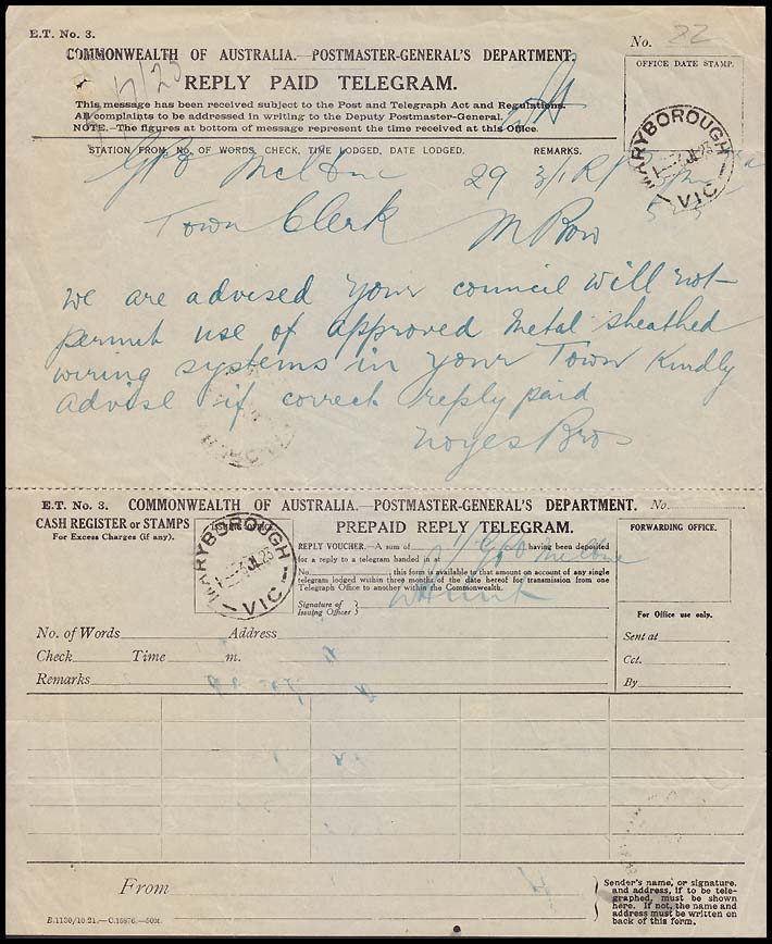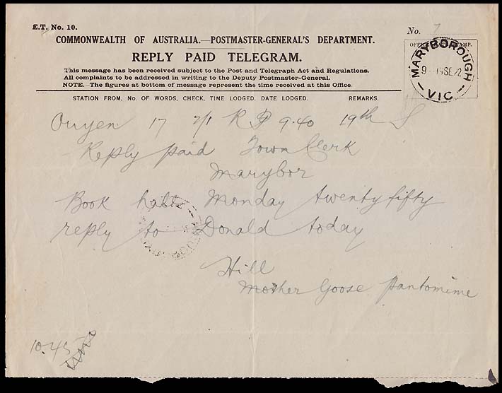 Complete reply paid telegram sent from Melbourne to Maryborough, Vic (7 July 1923). Characteristics: