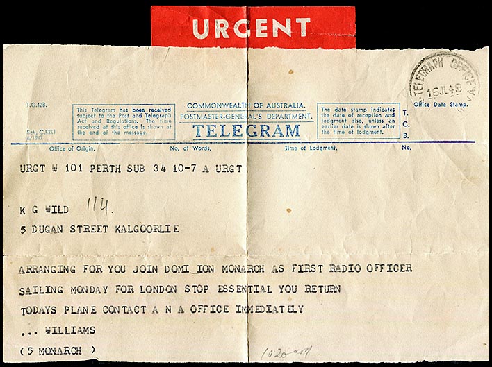 Telegram from Perth to Kalgoorlie Characteristics of label: See the references to the Dominion Monarch elsewhere. |
