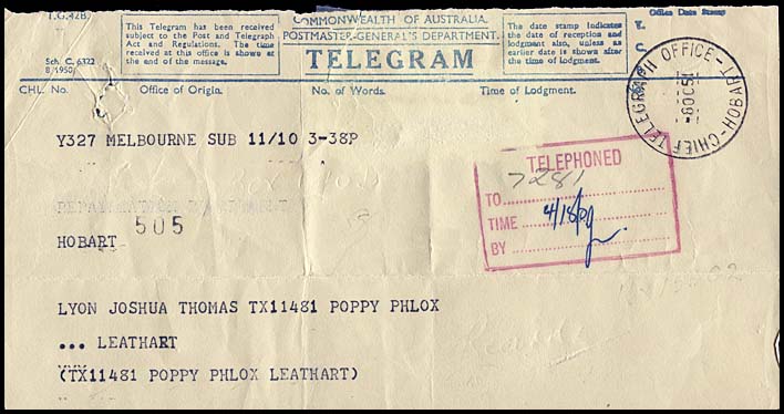 10B (50) | Sch. C. 6322 8/1950. | 8 October 1951 at C.T.O. Hobart. | C |