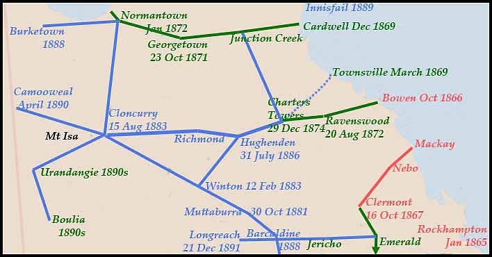 The first line to the west in this central section was from Clermont and it linked to Mackay via Fort Cooper (Nebo). Soon after, that line was extended south to Emerald and then to Springsure (2 April 1872 - which was about 9 years after the Cullin-La-Ringo massacre). |