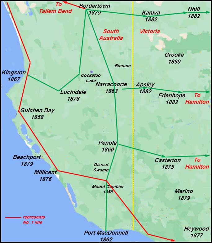 The first construction activity in this region was in association with the No. 1 line from Adelaide to Mount Gambier and then across the border to Portland and Melbourne. Later construction activity was associated with three other lines across the border with Victoria.