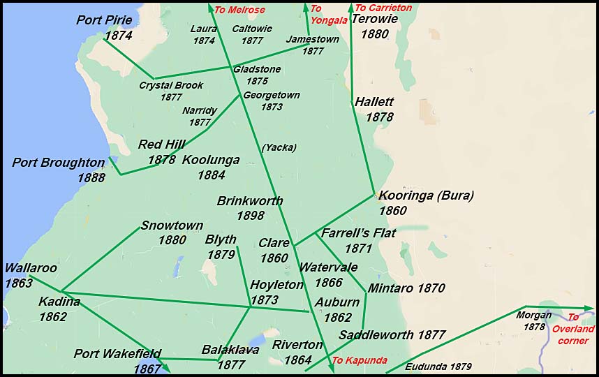Railway lines had been opened in various localities in this general region. On issue was the transport of produce to one or the other of the ports at Wallaroo, Broughton or Wakefield. These lines served the broader region including Blyth, Snowtown, Balaklava and Riverton. The railway lines often facilitated telegraphic connections.