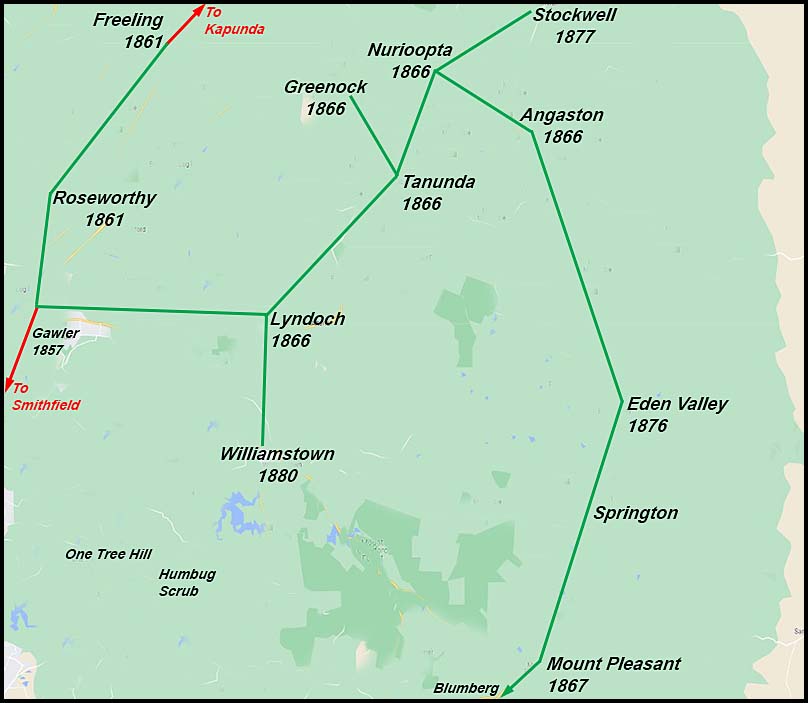 The first line constructed into the Barossa region came from Gawler. It was an extension of that line through Roseworthy and Freeling and it was then extended directly to Clare. Lines built after 1861 were all contained within the valley and finally met those lines coming from Nairne and Gumeracha.