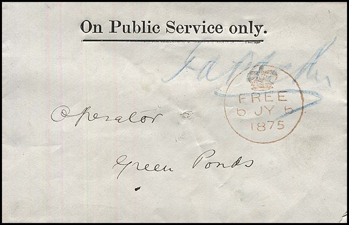 The front of the official envelope showing that the contents were on official business and addressed to the OPERATOR (of the telegraph station) at Green Ponds.