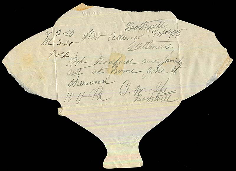 The inside of the envelope showing the message being sent to Rev. Adams. The message reads: