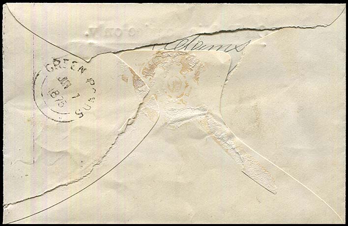 Arrival backstamp of Green Ponds on 7 Jul(y) 1875. The flap was damaged when the sealing wax was removed. |