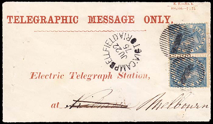 Campbellfield to Melbourne A rare internal franking of a pair of the 6d blue Laureates tied with a killer 1 of Melbourne. Also redirected to Melbourne. An extraordinary express delivery item. The telegram had been unpaid and the fee of 1/- due was indicated by the pair of 6d Laureates cancelled at Melbourne. Reverse side is blank. Provenance: |