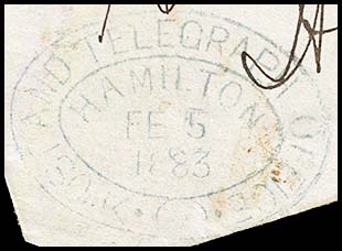 ![]() Hamilton Belt & Buckle date stamp in blue. 5 February 1883. Earliest recorded date. |