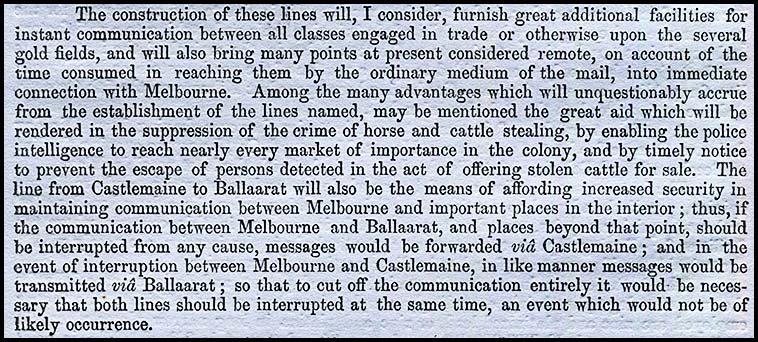 As described elsewhere, the first Victorian lines ran from Melbourne to Williamstown. In September 1854, an extension of the line was commenced and, on the 5th of December following, communication with Geelong was established. In November 1855, it was decided to extend the lines, respectively from Geelong to Ballaarat and from Melbourne to Sandhurst via Castlemaine (McGowan's Report for half year ending 31 December 1856). Clearly the extensions were designed to extend telegraphic communication to the goldfields.
