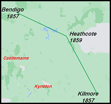 On 9 September 1857 the Bendigo Advertiser expressed its opinion of the necessity for a line coming from the north-west from Sandhurst to Heathcote as follows: "The Goulburn diggings have been rapidly increasing in importance, and they now contribute at least two-thirds of the escort that leaves Heathcote which has of late reached two and three thousand ounces. Is it not strange that the Government has not established postal communication between those diggings and Sandhurst to which there is a daily mail and an electric telegraphThe telegraph referred to was that from Melbourne to Sandhurst.. Is it not merely commonsense to connect such places with a town, at no great distance off, which possesses such advantages?".