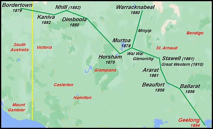 Line 5: | Melbourne through Newport Test Box, Werribee, Geelong, Wabdallah, Meredith, Ballarat, Learmonth, Beaufort, Ararat, Stawell, Murtoa, Horsham, Dimboola Railway Station, Dimboola, Nhill, Kaniva, Lillimur North, across S.A. border to Bordetown. |