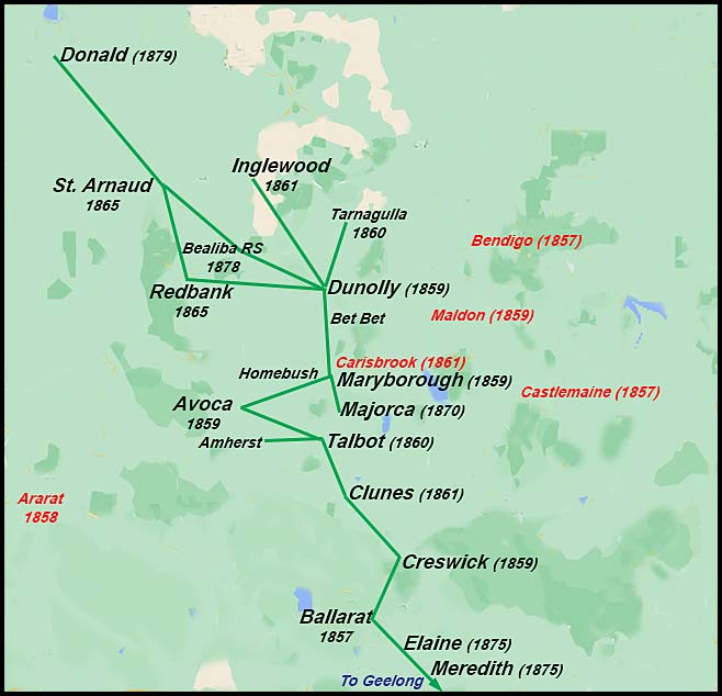 To add to the Daylesford line: Smeaton was connected in December 1881 by way of Broomfield, Wallace Town, Allendale and Ristori Town. The Ballarat Star 1 December 1881.