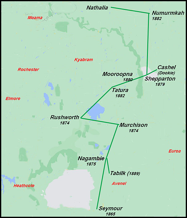 Stations along the Albury lines were opened at Seymour (1865) and at Avenel (1874). Heathcote was well to the west of either place - hence not really allowing the possibility of implementing the above suggestion. These stations did however open the possibility of branching off the Albury lines to the north and passing through the growing centers of Murchison and Rushworth. Indeed, as reported in The Argus on 26 March 1873, "a deputation intended to wait upon the Postmaster-General to request him to undertake the construction of a telegraph line from Seymour, along the valley of the Goulburn, through Nagambie to Murchison and Rushworth. Mr. Langton was, however, out of town and the interview had to be postponed".