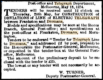 The Weekly Times of 28 November 1874 reported that "A deputation, consisting of Professor Hearn, Mr. Stevenson and other residents at Dromana, was introduced by the Hon. Jas. Balfour and Mr. Purves, M.P., to the Postmaster-General, Tuesday, with the view of obtaining telegraphic communication for that place. They represented that the wire ran through the township and that they were prepared with a substantial guarantee that, in the event of an office being opened, the department would suffer no loss. Under the circumstances, Mr. Ramsay consented to comply with their request, conditionally upon an approved guarantee being duly executed".