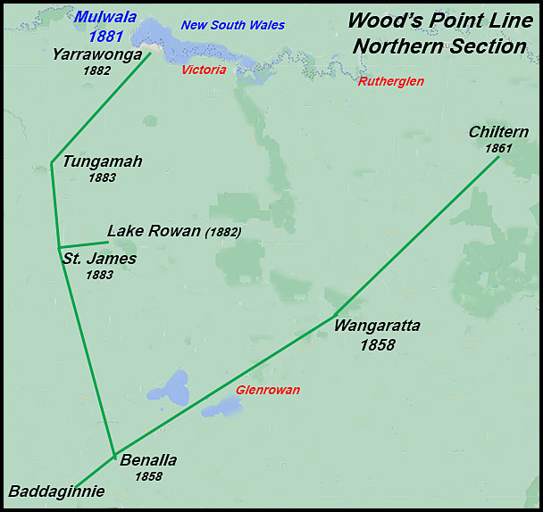 A second line was constructed as part of the Wood's Point line but to the north from Benalla. Its main purpose was to establish another inter-colonial link with NSW through Yarrawonga and Mulwala (in NSW).
