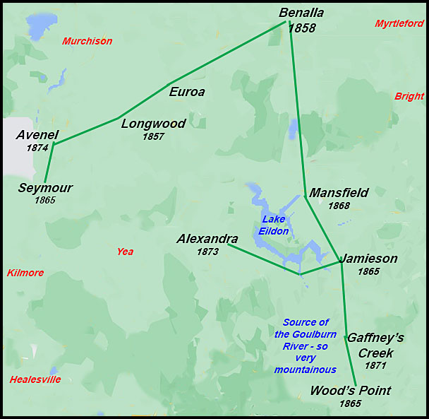 There were discussions about the construction of the lines to Jamieson and Alexandra. At one stage the suggestion was that the line from Seymour/Tallarook to Yea should be extended to Alexandra and then to Jamieson. That would however have resulted in a great deal more traffic to the lower part of the already overloaded inter-colonial line to Albury and the Heathcote Branch. In addition, such a connection would not further the possible network connections to be gained by extending the line from Benalla north to Yarrawonga and south to Wood's Point (and possibly to Gippsland).