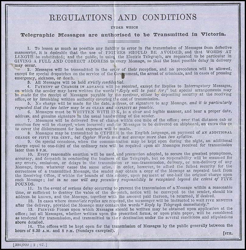 | Heading and notes: | No form number. Electric Telegraph, Victoria in curved line above crest. |