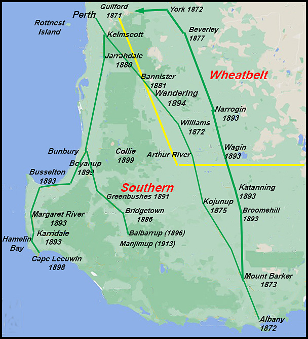 The original intention for the first line south to Albany was to construct the line from Perth to Bunbury and then via Bridgetown to Albany. As noted elsewhere, Albany had the only deep-water port in Western Australia and was the first port of call for ships with mail. The coastal route to Albany involved crossing the Darling Range inland from the coast - perhaps starting to the south-east just after Bunbury and before Vasse (Bussleton).