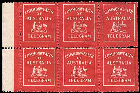 C of A Telegram label. Marginal block of six. Reverse printed in red on unwatermarked gummed paper and perforated 12. Size: 26 × 23 mm. The only known sheet still in existence is shown elsewhere. There are at least three blocks of six including two marginal blocks - one with selvedge on the left and another on the right side - and one strip of 6 with selvedge at the top. |