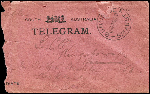 Delivery envelope used to deliver the above Cablegram at Burnside before being redirected.