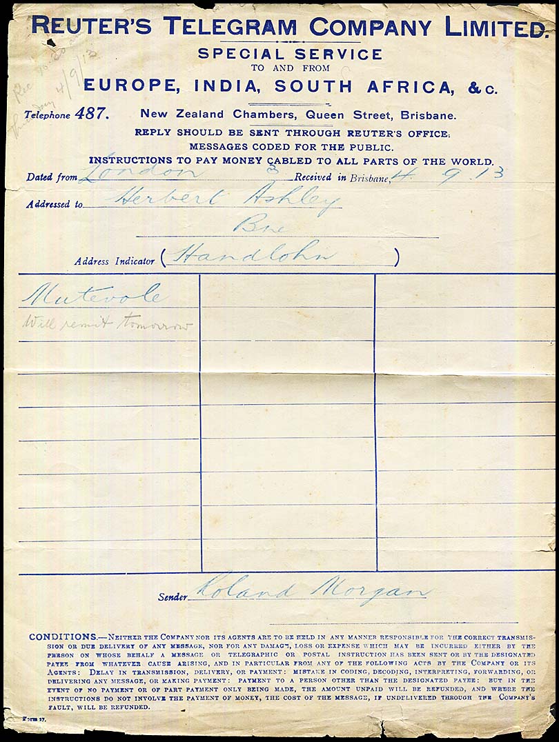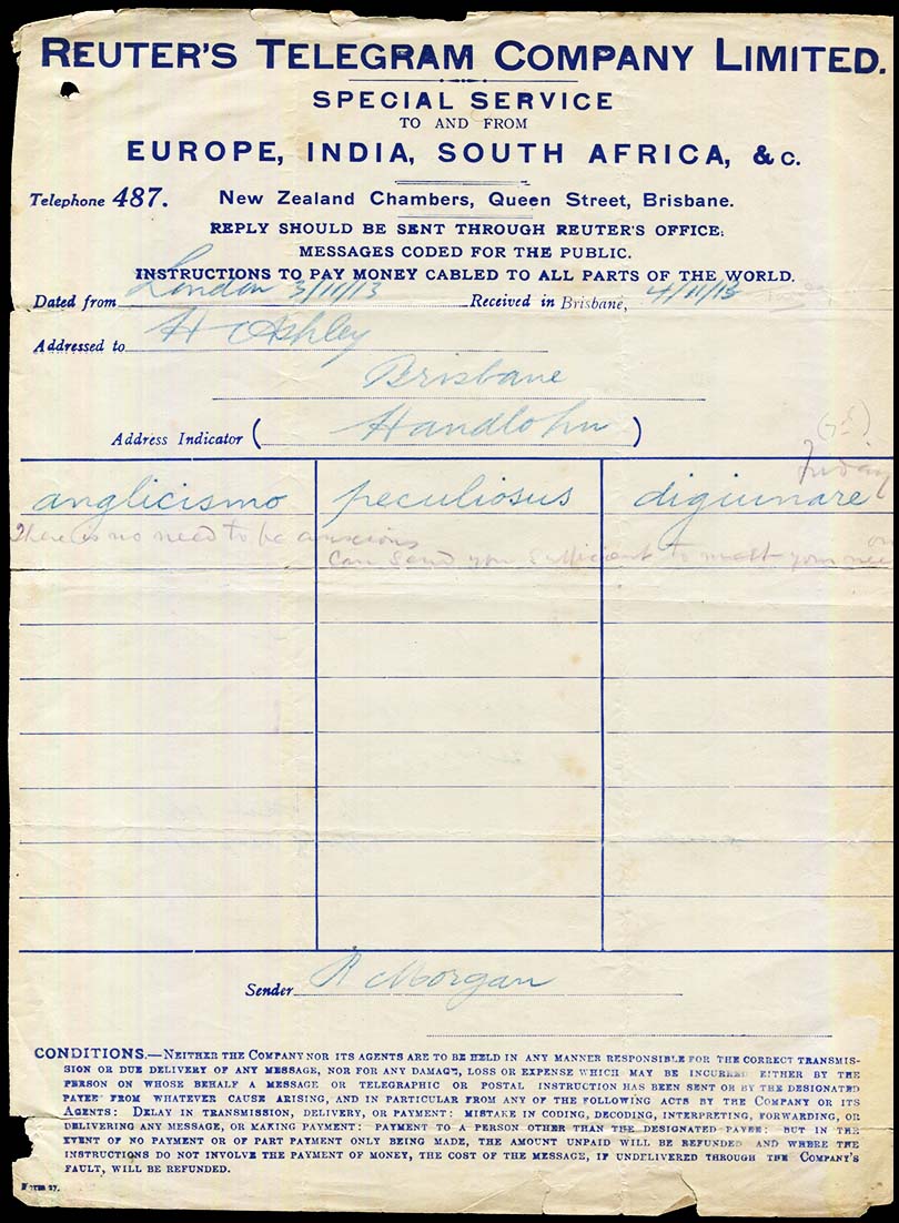 ![]() Used on 4 September 1913 - Cable message to the Indicator code HANDLOHM (Herbert Ashley) from his colleague in London (Roland Morgan). The two gentlemen used the coded address to exchange messages between them. The message is coded - using their own code: for them, MUTEVOLE meant "Will remit tomorrow". Using the one word instead of three would have reduced the cost significantly. |