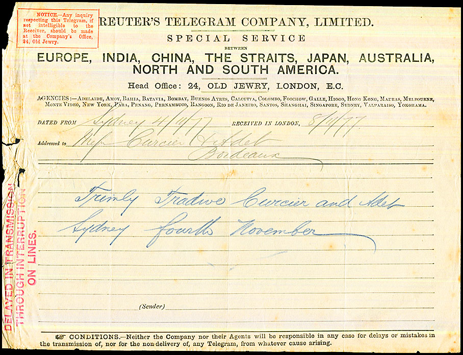 Message to Bordeaux, France from Sydney via London.