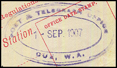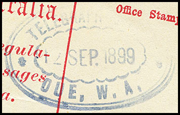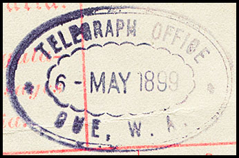 ![]() 12 September 1899. Telegraph Office in blue. Used on WC-DO-5A. |