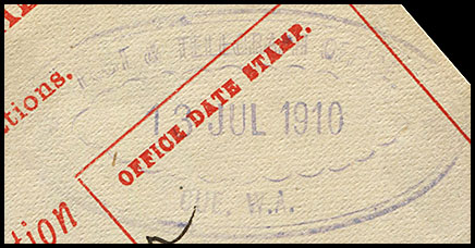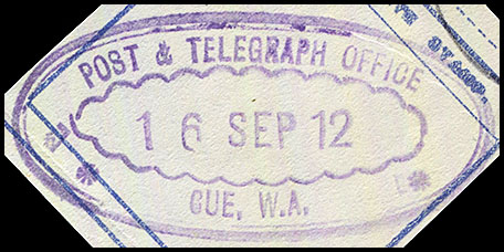 ![]() 12 January 1912. Oval used in blue on an urgent rate telegram. Note the small split in the LH of the inner scalloped ellipse. |