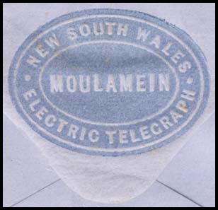 Moulemein was one of the 29 Telegraph Offices included in the special printings of delivery envelope NC-EO-3. These envelopes incorporated an embossed oval seal (EO6-ET) on the flap of the envelope with NEW SOUTH WALES at the top and ELECTRIC TELEGRAPH at the base. The office name was embossed across the centre of the seal.