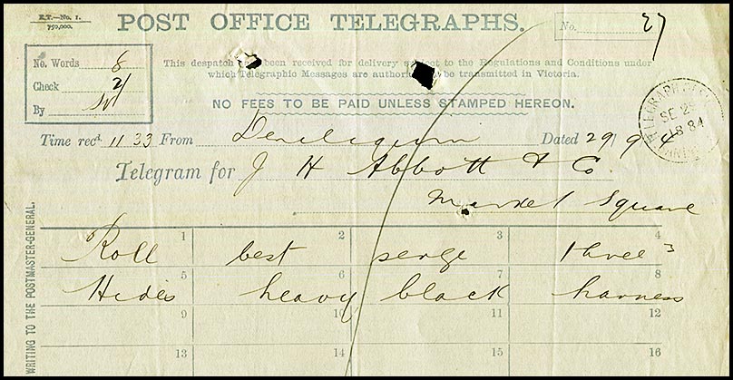 The earliest indication of the operation of the Deniliquin Telegraph Office is a message on a telegram delivery form (VC-DO-11B) at Sandhurst on 29 September 1884 from Deniliquin - hence about 23 years after the Deniliquin Telegraph Office became operational under government control. |
