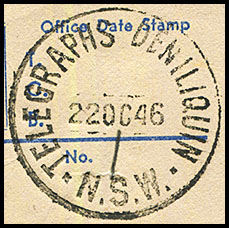 The usual Deniliquin postal date stamp was also used on telegrams and telegraphic Money Orders. | ![]() 16 August 1949. Used on a Telegraphic Money Order |
