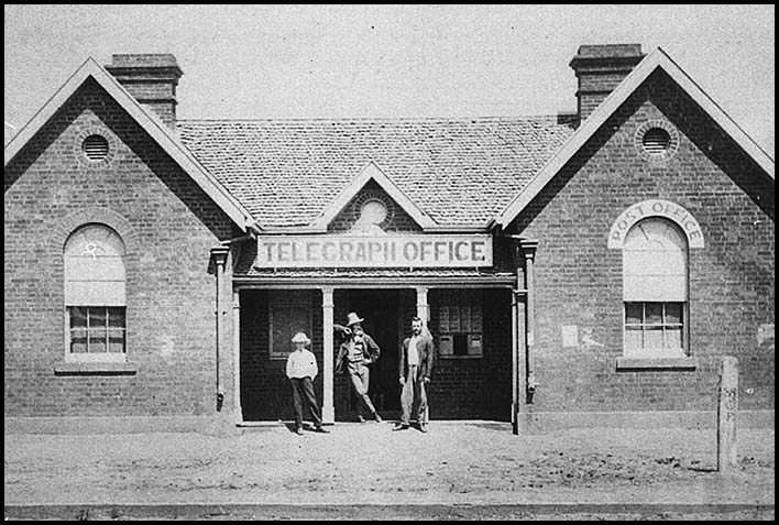 The Telegraph Office opened on 4 May 1866. It changed name from Jereelderie on 10 January 1890. The Pastoral Times of 29 August 1868 reported " We regret to hear that the telegraph office at Jerilderie is closed owing to want of support — the guarantors having declined to supplement the local receipts — still the office can be opened at any future time when prospects are better than at present". On 19 September, the Times followed up this article with: "There was a Telegraph Office opened at Jerilderie on the guarantee principle. Five local persons guaranteed to the Government to make up any deficit between the gross receipts and and the gross costs of the office, but recently the guarantors had to pay £20 each to make up the deficiency. Having, I suppose, "done enough for fame", the guarantors declined to be mulcted any more, so the office was closed. I hear that the receipts were £120 for the year—the Government might very well place a line-man at Jerilderie capable of sending messages — the expenses of the electric telegraph working are far too heavy for these road-side stations and I cannot see on what just principles the Government can expect any men to guarantee a deficiency in these cases, seeing that the Government receives such large sums of money for land sales, rents assessments, publicans' licenses, etc". This situation in Jerilderie was the catalyst for the proposal of a possible alternative strategy for the guarantee system- described elsewhere. That actually raised the suggestion that women could be employed in Telegraph Offices as electricians - even at Jerilderie. Good things happen - and in December 1878, with little apparent fanfare, a tender to construct a Post and Telegraph Office at Jerilderie was awarded to Mr. P. J. D'Arcy. The Kelly Gang held-up the Jerilderie branch of the Bank of New South Wales in February 1879 and, while in town, inflicted considerable damage to the wires, insulators and the telegraph poles. See elsewhere for the story. Personnel: June 1866: Mr. Thomas Trader, junior operator at Braidwood was appointed Station Master. December 1874: Mr. Henry Jefferson was appointed Station Master to replace Mr. Daniel Ryan Kenane who was transferred to Burrowa. |
