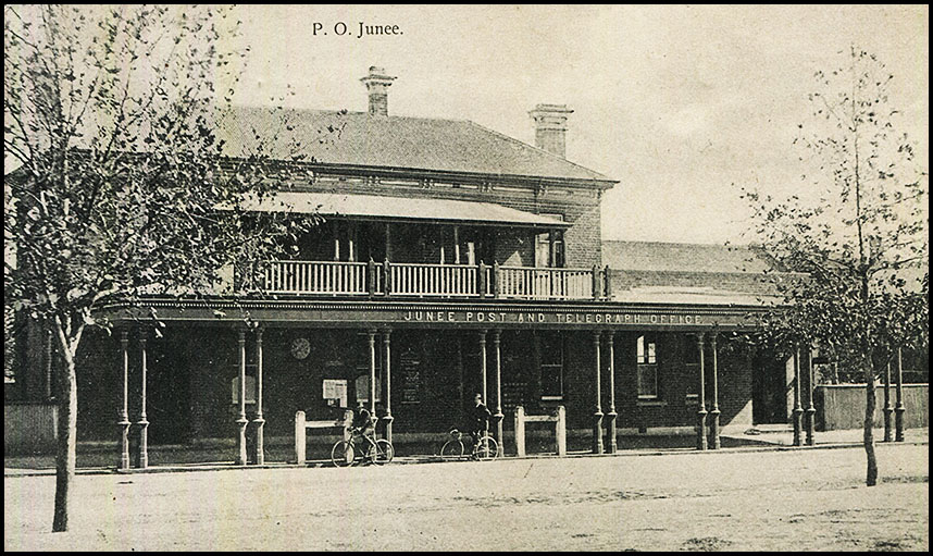 A Post Office opened at Junee on 1 May 1862, It closed on 2 September 1878 only to open the next day as a Receiving Office. It changed name to Old Junee on 16 July 1881 and became the Post Office at the Railway Station. From 19 June 1909, it also acted as a telephone station with telegraph responsibilities. On 1 May 1913, it became a Post and Telegraph Office and was removed from the Railway Station. On 6 July 1878, a Telegraph Office and Receiving Office were opened at the Railway Station. That Office changed its name to Junee Junction on 16 July 1881 and then to Junee Post and Telegraph Office on 1 November 1893. In November 1887, a tender was awarded to Galty and Flook for the construction of a Post and Telegraph Office. |