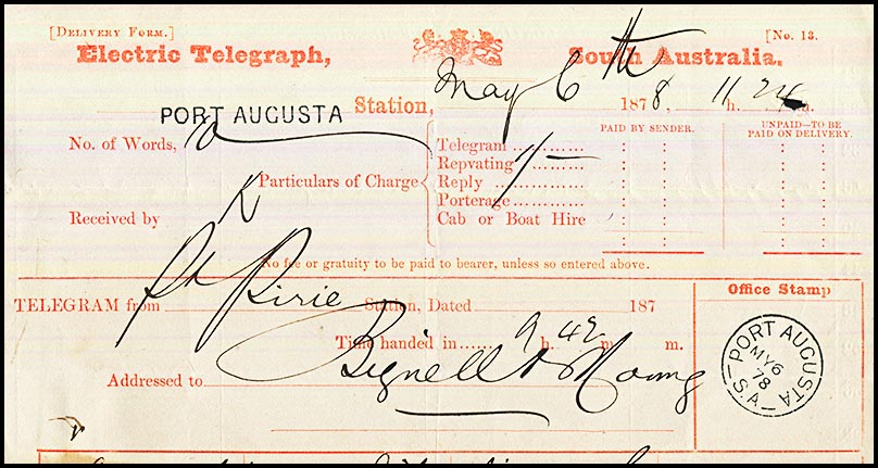 The earliest recorded evidence of the operation of the Port Augusta Telegraph Office is a delivery form (NC-DO-6Aa) used on 6 May 1878 for a message sent from Port Pirie to Post Augusta.
