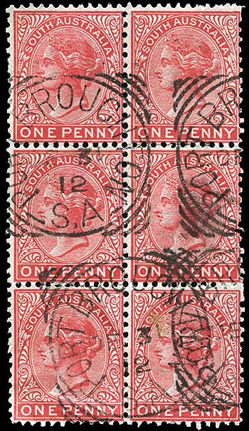 The block on the right of six 1d red on Crown over A watermark has one complete and three partial strikes. It could have been used to pay the 6d. rate for a telegram sent within 15 miles.