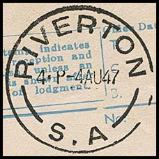 In June a deputation presented the petition containing 248 signatures - mainly from freeholders and leaseholders - to Mr. Bagot. He indicated "he looked favourably as the request". A Proprietor had offered to make a gift of 2 or 3 allotments in the heart of the township for the sire of a Telegraph Station, a Post Office and the Local Court. (Adelaide Observer 20 June 1863). New Telegraph and Post Offices opened on 1 March 1864. Riverton later became a station on the Roseworthy - Peterborough railway line which reached the town on 20 December 1869. A squared circle date stamp could also have been used on a telegram form. The Office was certainly issued with such a date stamp. |