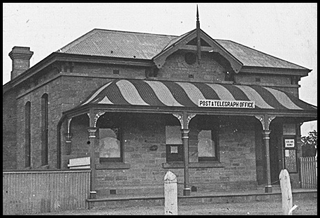 Tenders were let for the construction of a Post & Telegraph Office in January 1888 for £398. A branch line connected Cowell to the main Port Augusta-Port Lincoln line and that line was completed by Mr. Knuckey, of Adelaide, in about three weeks. The telegraph was seen to be a great benefit to the district. About 277 km from Adelaide. |