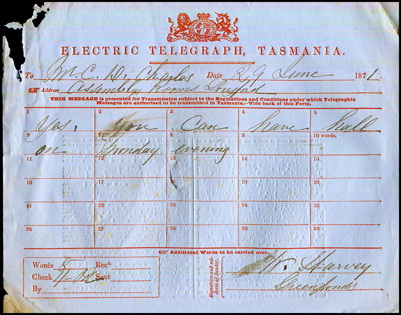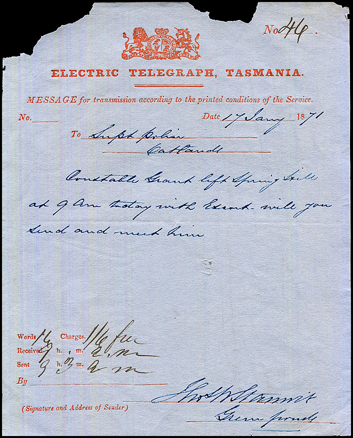 The earliest indication of the operation of the Telegraph Office is a transmission form sent from Green Ponds to the Superintendent of Police at Oatlands on 17 January 1871.