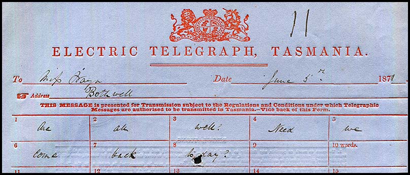 The earliest recorded example of telegraph use at Bothwell is a transmission form (TC-TO-1B) dated 7 November 1870 used for a message from Bothwell to Hobarton - see elsewhere.