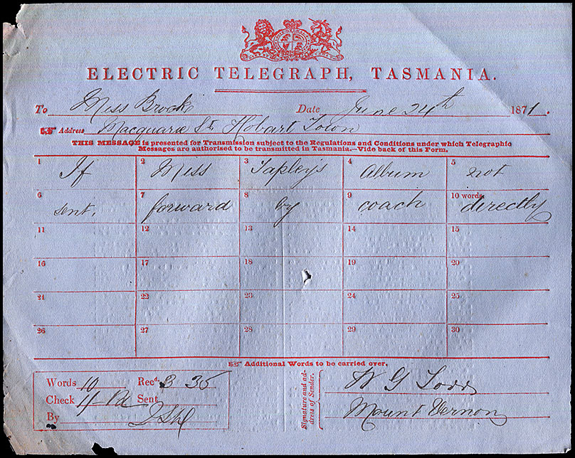 To enter the discussion about the use of names essentially at present referring to the same location, the following transmission form (TO-TO-2) was used for a message to be sent from Mount Vernon to Hobart on 24 June 1871.