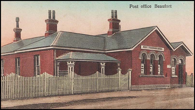 The Beaufort Telegraph Office had opened as part of the first line to South Australia. As the telegraph network grew, the original connections were re-routed and so by the early 1860's, they were integrated into the Bordertown (No. 5 West) line.
