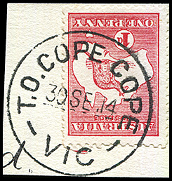 ![]() Framed St Arnaud postal date stamp plus straight line Office name. 1 April 1909. Used on VI-DO-2B. |
