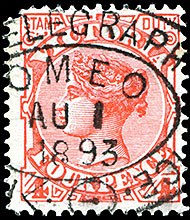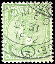 ![]() 31 December 1892. On a 9d apple green with inverted watermark. |