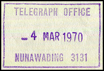 The Post Office - possibly including telegraph facilities - was opened in May 1937. Money Order facilities were extended to the Office in March 1938. Between the Heidelberg and Lilydale lines. |