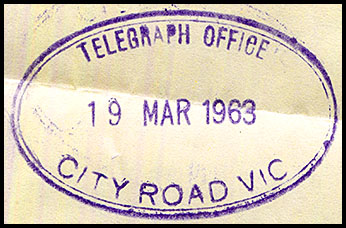 City Road is located about 1.5 k south-west from the Melbourne G.P.O. It had opened as a Receiving House on 28 August 1892, It was reclassified as a Post Office about 1902. No source - including Watson et al - mentions that City Road ever had a Telegraph Office. |