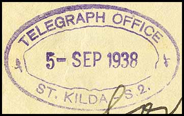 Oval date stamps. St. Kilda was issued with five formats of rubber oval TELEGRAPH OFFICE date stamps: a pause of 35 years or so after using its Belt & Buckle date stamp. |