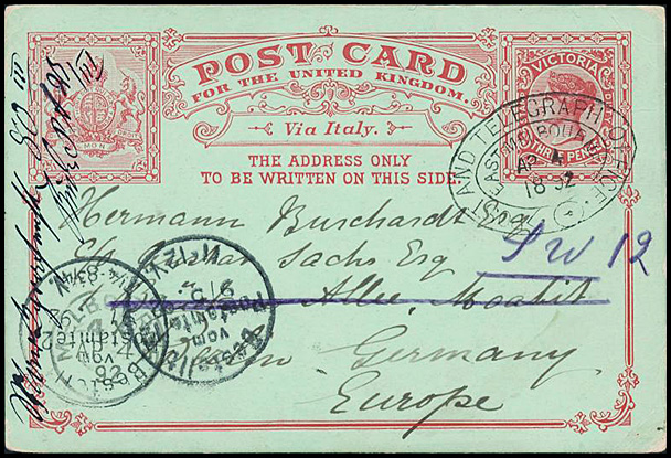 Torsten Weller noted that the 3d red postal card is inscribed "FOR THE UNITED KINGDOM VIA ITALY". It was sent to Germany and additionally franked with a 2d violet Naish and a 1d brown cut-out from a postal card to pay the 6d pre-UPU foreign ship latter rate. The concessional 2d or 3d postcard rates (depending on the route) only applied to cards sent to the United Kingdom. Postcard rates to other countries were not introduced until after Victoria joined the UPU in October 1891. Steig states (p.30) that "cards used during the correct period (prior to 1 October 1891) are very scarce. |