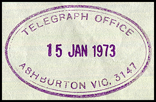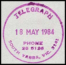 The Telegraph Office was opened in August 1872 after telegraphic communication had been established on 1 August. South Yarra was issued with three types of date stamp for use with telegraphs: |