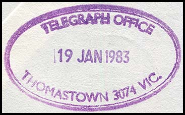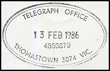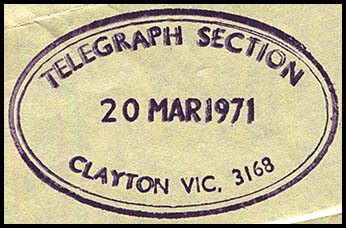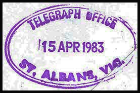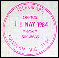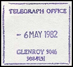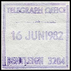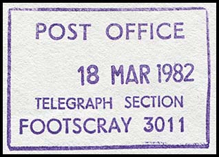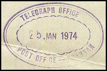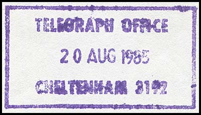 A rubber rectangular TELEGRAPH OFFICE date stamp Size: 25½ × 48 mm. Used: 17 April 1975 to 20 August 1985. Rated: RRR. Ni]umber in the Census: 3. |
